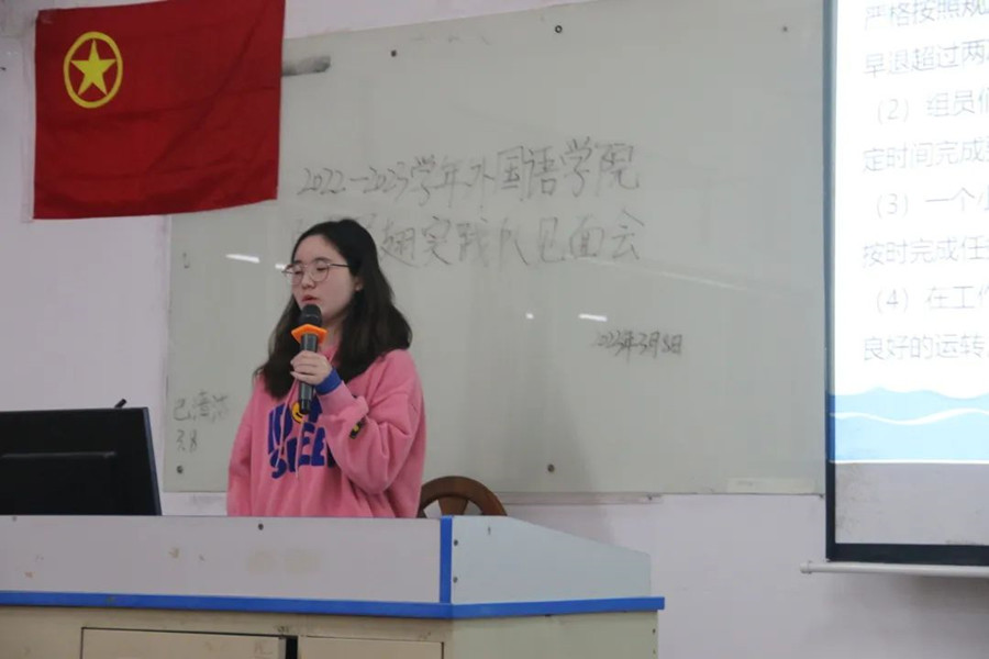 阳光展翅实践队队长高晶晶向队员们概述了新学期实践队即将开展的志愿服务项目,倡导在志愿服务过程中要贯彻外国语学院八字方针,同时希望阳光展翅实践队全体成员能够同心协力打造一支优秀的志愿服务队。