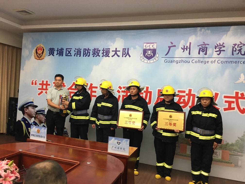 黄弢代表广州商学院为学校消防队参加区消防大比武获奖代表进行了颁奖。