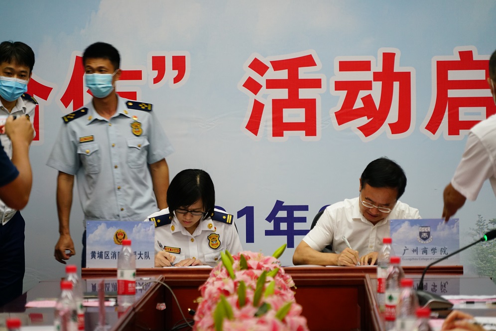 黄弢、林艳虹分别代表广州商学院和黄埔区消防救援大队在共建协议上签字