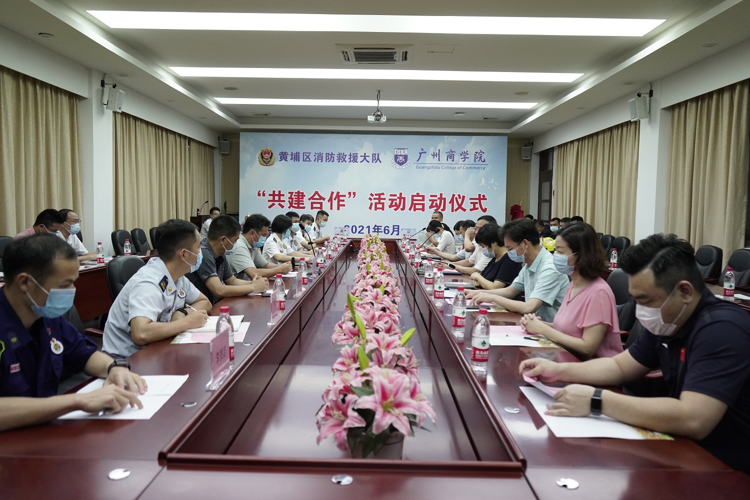 为深入贯彻习近平总书记关于防范和化解重大风险的一系列重要指示批示精神,坚持“共建、共治、共享”理念,共建平安校园、平安黄埔,6月2日下午,我校与黄埔区消防救援大队在第二行政楼208会议室举行共建签约仪式。黄埔区消防救援大队书记、教导员林艳虹及部分消防官兵,龙湖街道党工委委员、武装部长卢希斌及部分工作人员,我校校长黄弢,相关职能部门负责人,各二级学院党总支书记出席仪式。仪式由保卫处处长胡成业主持。