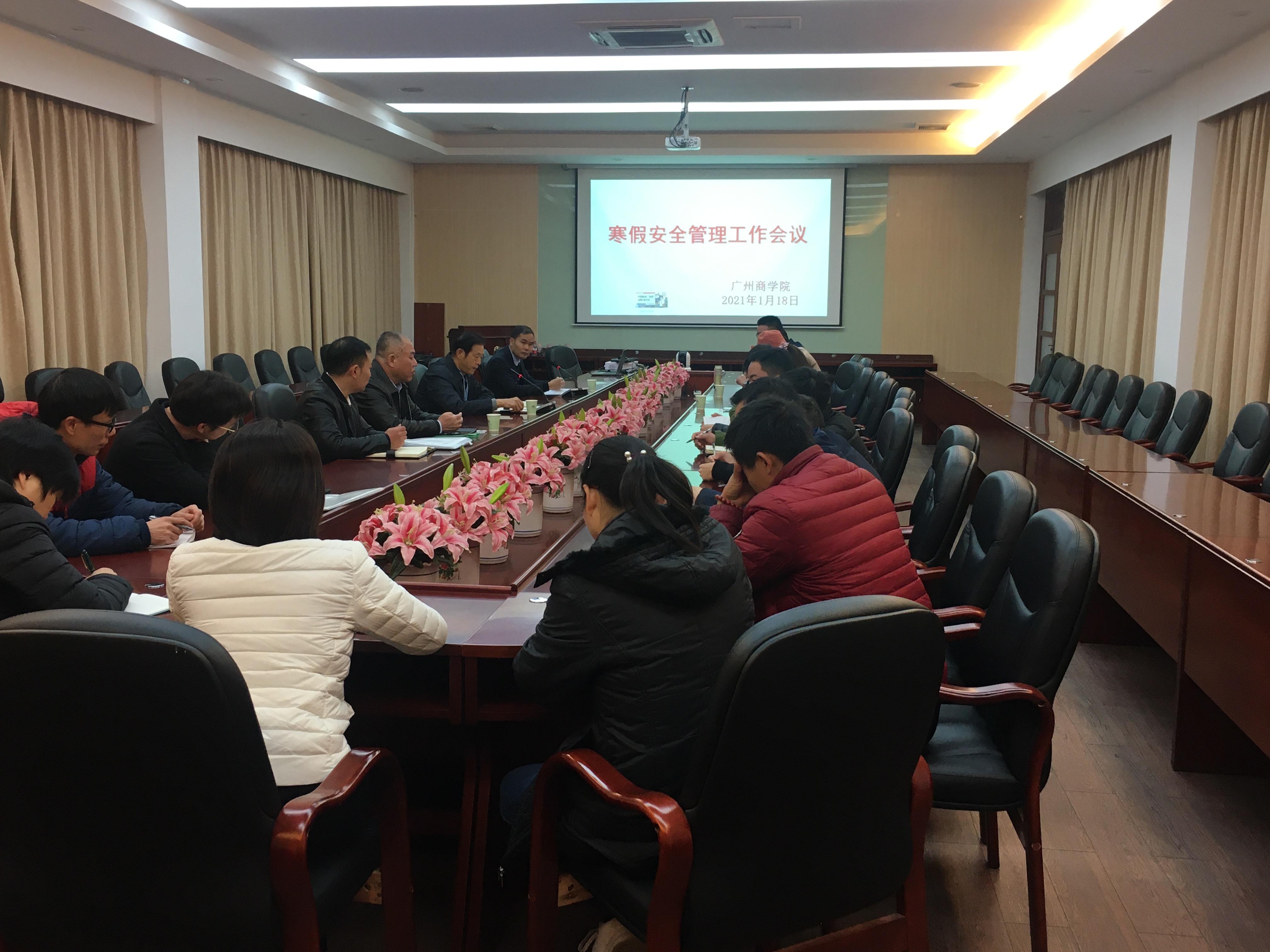 为落实《广东省教育厅关于做好2021年元旦、春节和寒假期间学校安全管理工作的通知》文件指示精神,我校分别发布《关于开展节前校园安全隐患排查工作的通知》(广商行字[2020]67号)和《关于加强寒假期间校园安全管理工作的通知》(广商行字[2021]1号)文件,对假期安全工作进行了全面布置,并于2021年1月18日上午9:30分在第二行政楼208会议室组织召开了寒假安全管理工作会议,对寒假的安全管理工作进行了全面布署,会议由学校党委吕泉荣主持,学校监事会主席刘炳荣出席会议,各职能部门负责人和各二级学院党总支书记参加会议。